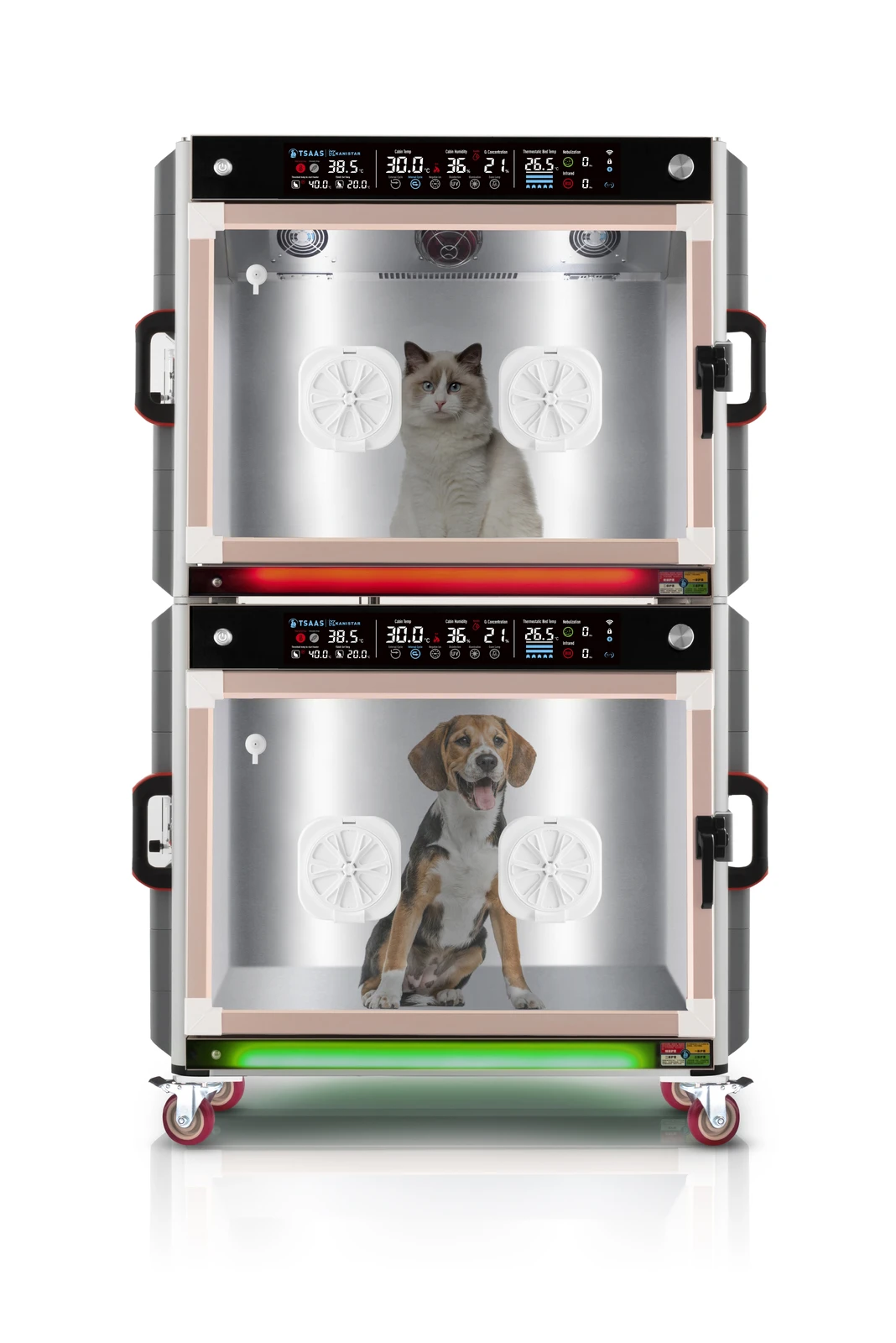 With advanced diagnosis, monitoring and treatment equipment and technology, our ICU helps to observe the qualitative and quantitative condition of your patient continuously and dynamically. The typical animal ICU machine on the market fails to close the gap between what we know human ICUs can do. In our redefining of the animal ICU, we hope to close the gap from being a simple enclosed space that provides temperature and humidity settings and offering a machine that can support multiple medical treatments, such as infusions and nebulization of medication, an oxygen therapy enclosure, the ability to purify the ambient air inside the containment, and more. Enjoy the animal ICU, redefined, in Kanistar’s TSAAS intensive care units.