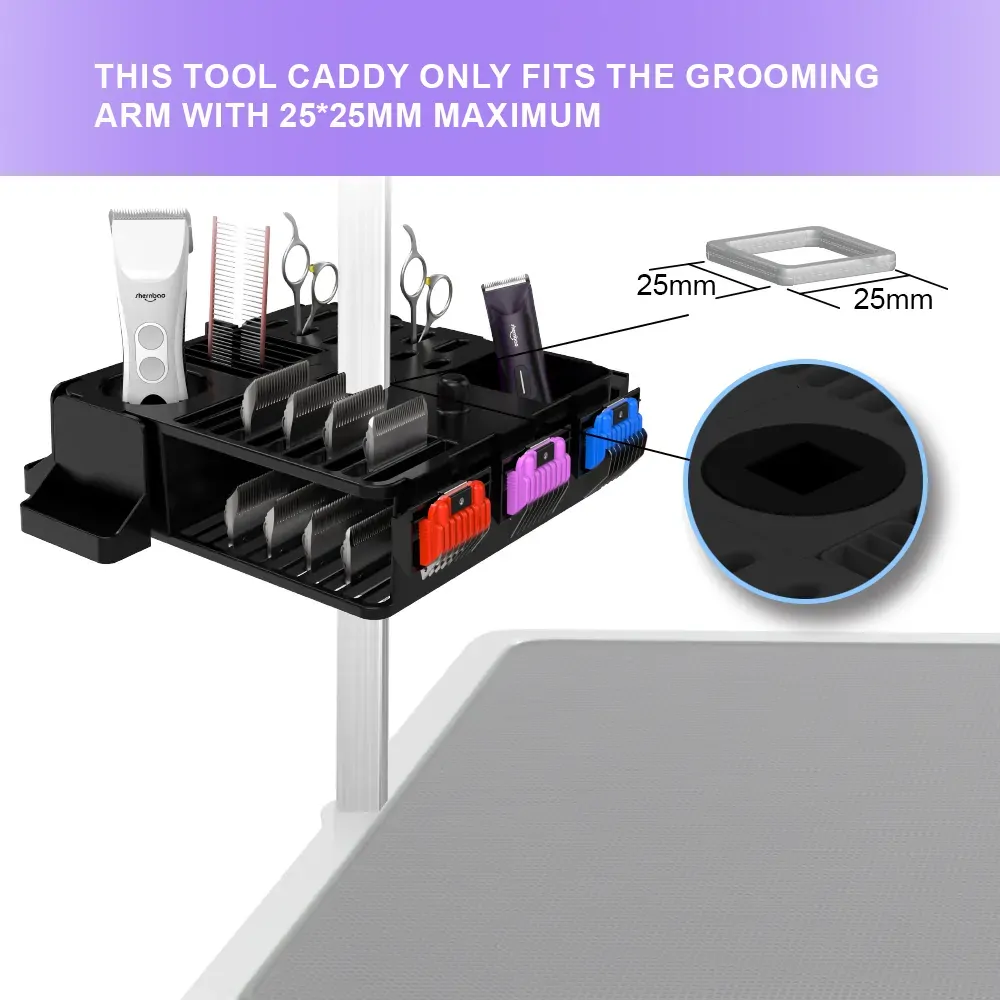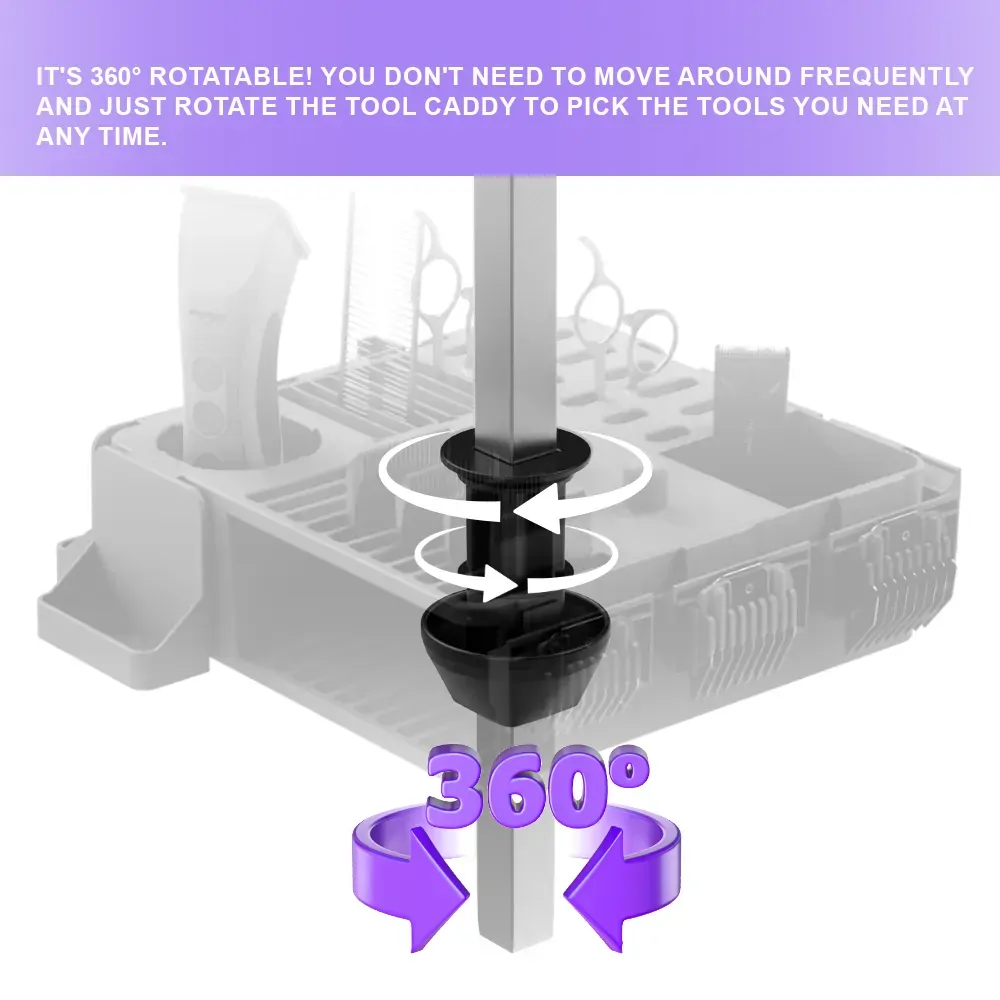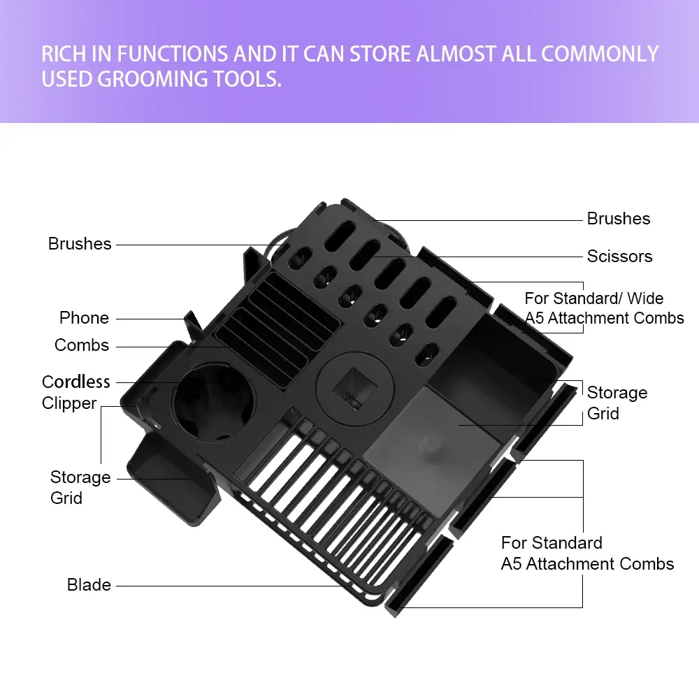 All in one organizer for your clippers, blades, comb attachments, shears, combs, brushes, nail clippers and your phone.